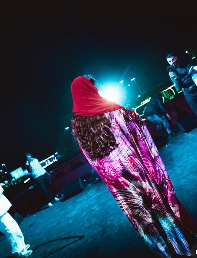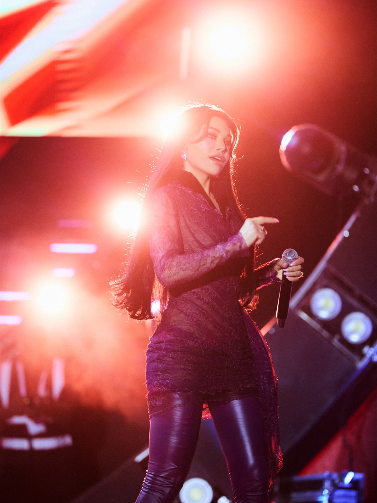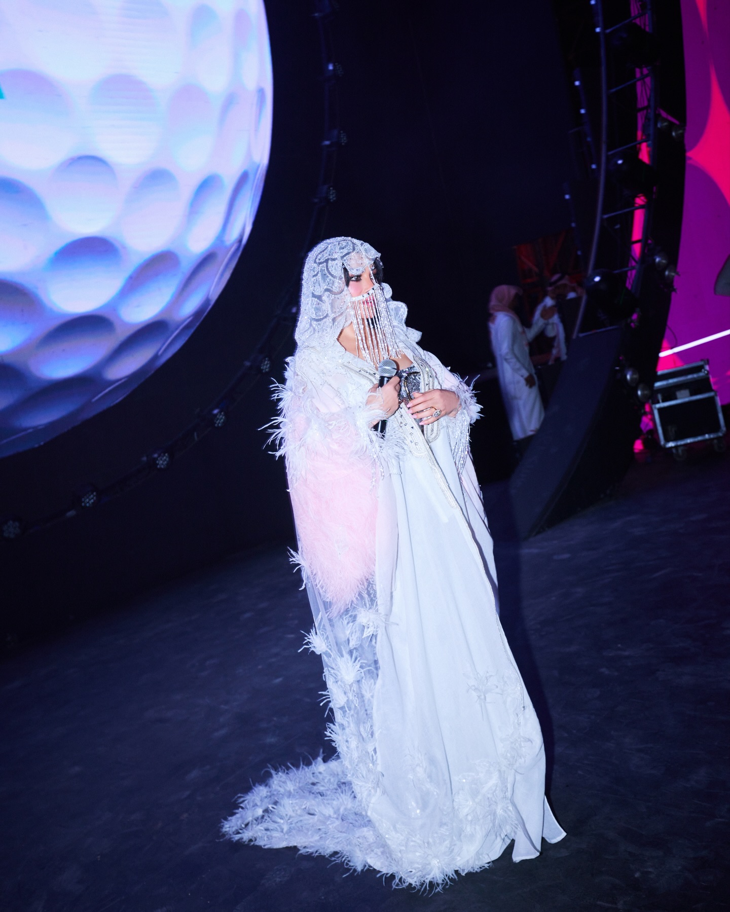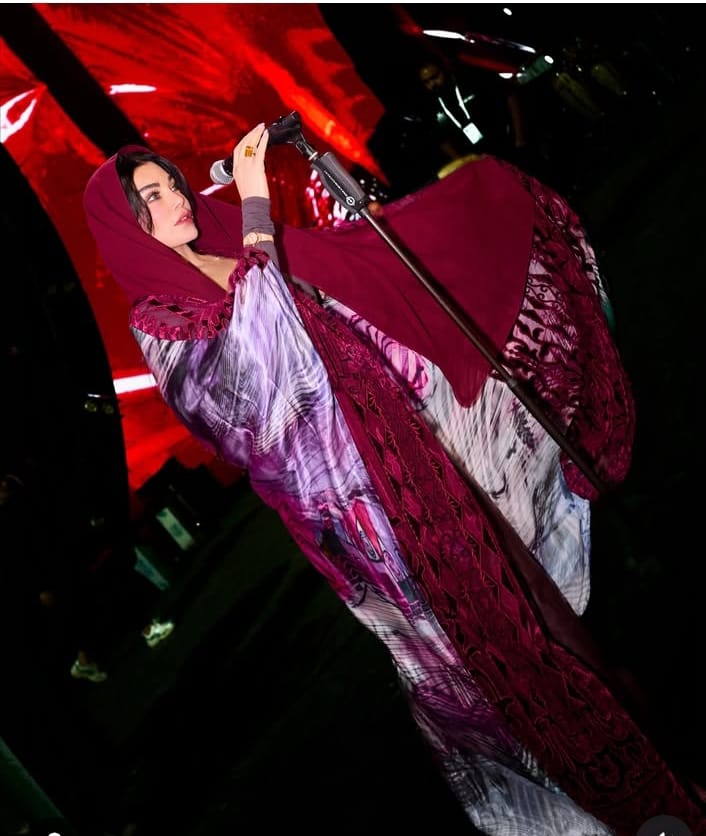 ارتدت عباءة بيضاء بلمسات تقليدية، وبرقعًا يعيد صياغة الهوية بأسلوب فني راقٍ، وقدّمت أغنيتها «أقول أهواك» بمشاركة فرقة السامري السعودية. كانت اللحظة أكثر من غنائية؛ كانت احتفالًا ثقافيًا، إذ اندمج صوتها مع الإيقاعات الشعبية، وردّد الجمهور كلمات الأغنية بانفعالٍ يشبه الاحتضان.
