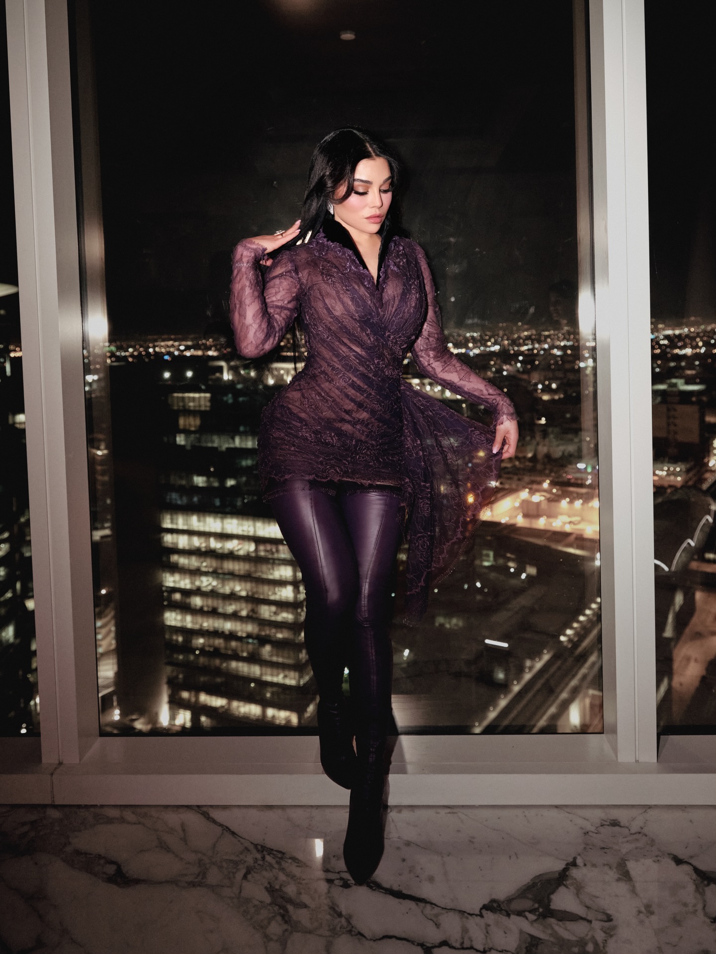 ارتدت بنطلوناً ضيقًا من الجلد الخمري المائل للنبيذي، منسقًا مع حذاء مطابق للون ذاته، فيما انساب فوقه توب شبكي طويل من التول بعقدة جانبية تشدّ الخصر بخفّة وأناقة. توقيع نيكولا جبران بدا واضحًا في دقّة القصّة وذكاء التكوين، أما الشعر الطويل الأملس، المنسدل على كتفيها، فكان امتدادًا لخطوط الإطلالة التي تتقن لغة الإغراء الهادئ.