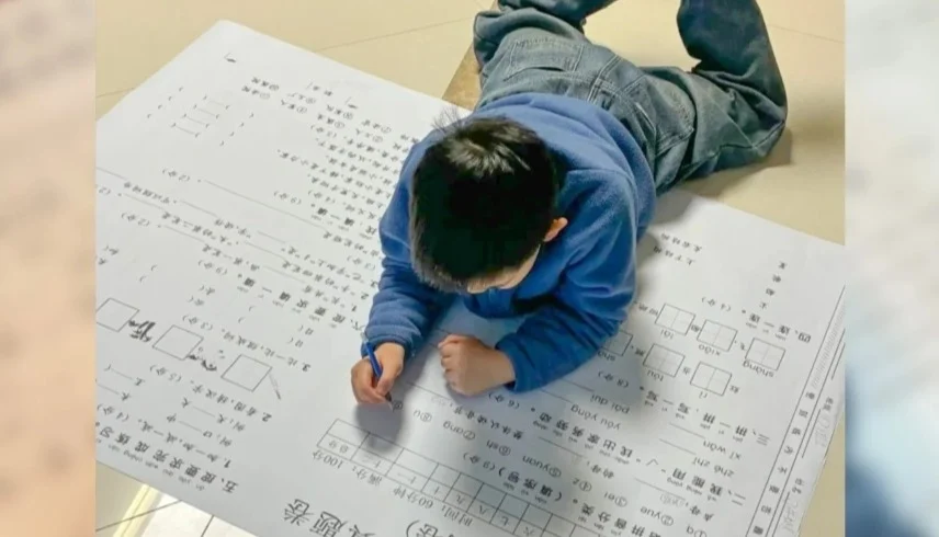 وأظهرت الصور الطفل ممدداً على الأرض وهو يعمل على ورقة اختبار لغة صينية يقترب طولها من متر واحد، بينما بدت الفراغات المخصصة للإجابات بحجم يده تقريباً.