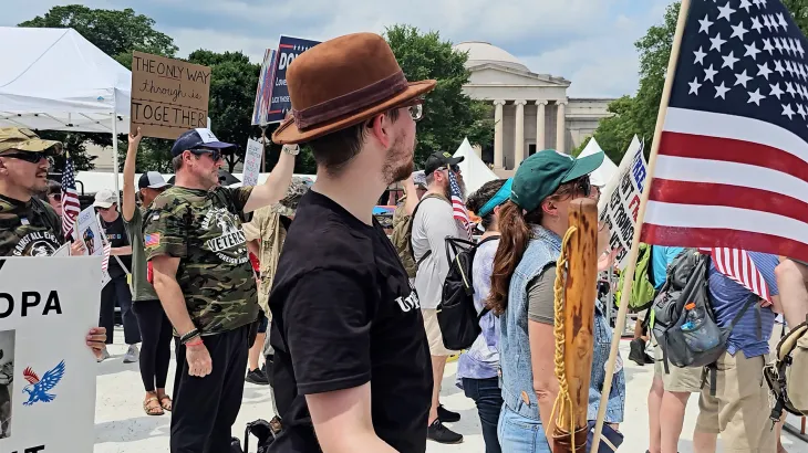 السياسي – تجمّع عشرات المتظاهرين الذين خرجوا في يوم المحاربين القدامى في العاصمة الأمريكية واشنطن، للتعبير عن رفضهم لسياسات الرئيس دونالد ترامب.