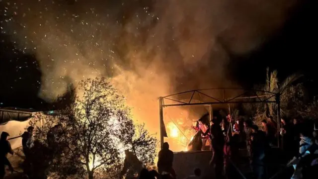 اشتعال النار في خيام النازحين بعد استهدافها من طائرات الاحتلال غرب خانيونس جنوب قطاع غزة pic.twitter.com/tb2ff07Vjh