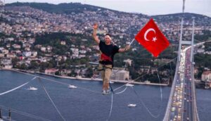 مشياً على الحبل.. مغامر يعبر من قارة آسيا إلى أوروبا